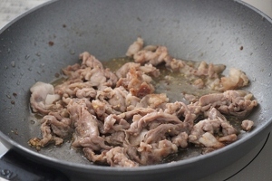 玉ねぎは皮をむいて7~8mm程度の輪切りにする。バラバラにならないように中心まで爪楊枝を刺す。豚肉はひと口大に切り、めんつゆを揉み込む。