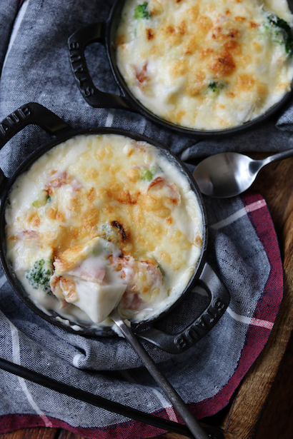 耐熱皿に薄くバター(分量外)を塗り、里芋とブロッコリーを入れて2をかける。上にシュレッドチーズ、パン粉を順にのせる。グリルまたはトースターで焼き色がつくまで10~15分焼く。