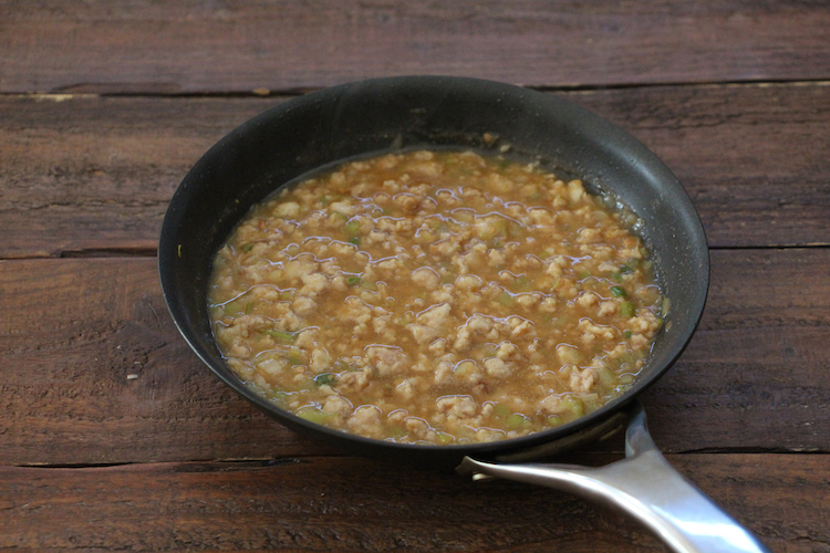 温めたフライパンに半量のごま油(大さじ1)をひき、ひき肉を入れ、中火前後で全体に焼き色がつくまでほぐしながら炒める。【A】を加え、全体をしっかりなじませたら、弱火で5分ほど煮る(お使いのみそによって塩分量が異なるので適宜ここで味を調える)。