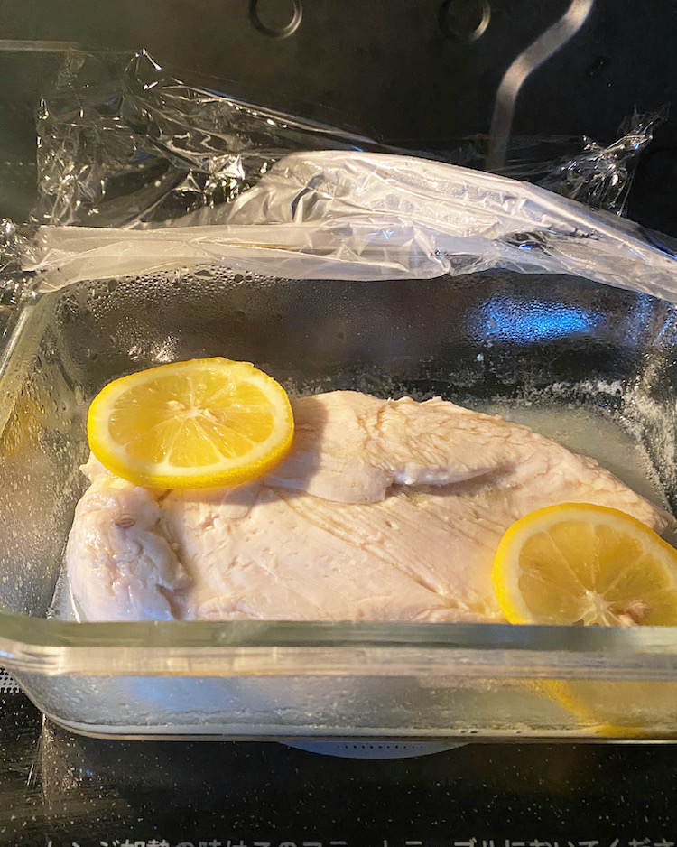 3の鶏肉を裏返し、再度ラップをして同様に2分加熱し、ラップをしたまま粗熱が取れるまでおく(余熱で火を通します)。