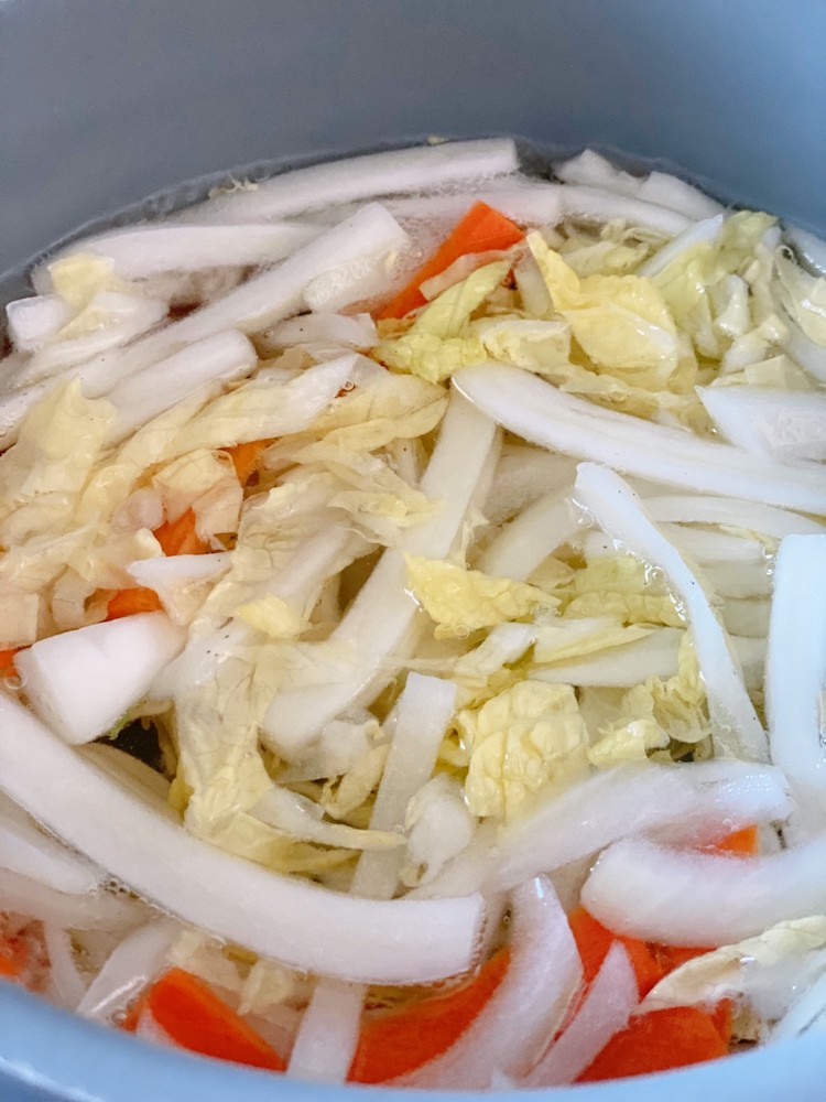 鍋に【A】、白菜、玉ねぎ、にんじんを入れて強火にかける。