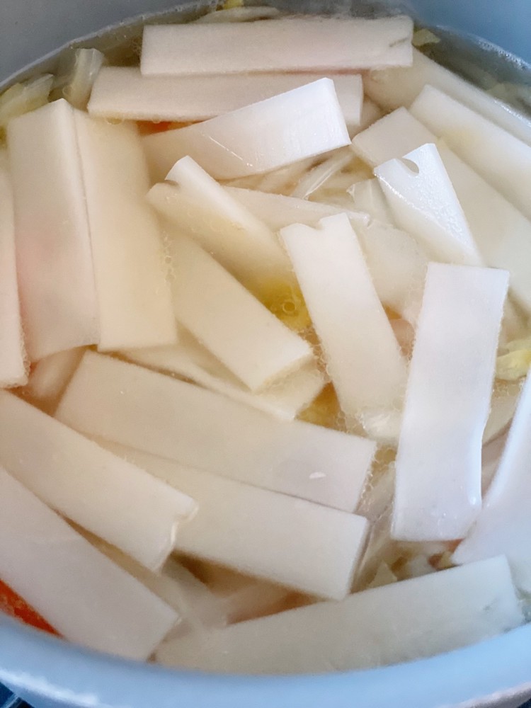 切り餅は薄切りにし、ソーセージは斜め半分に切る。白菜は細切りにして、玉ねぎは5mm厚さ程度に切る。にんじんは短冊切りにする。